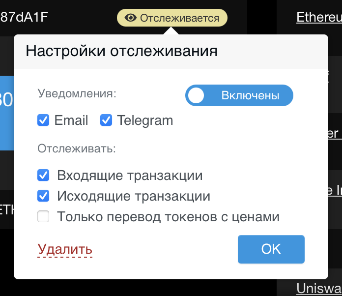 Установите уведомление, нажав кнопку «Отслеживать». Система автоматически отправит сообщение на вашу электронную почту или в Telegram (или на оба, в зависимости от того, что вы предпочитаете) и отфильтруйте исходящие транзакции.
