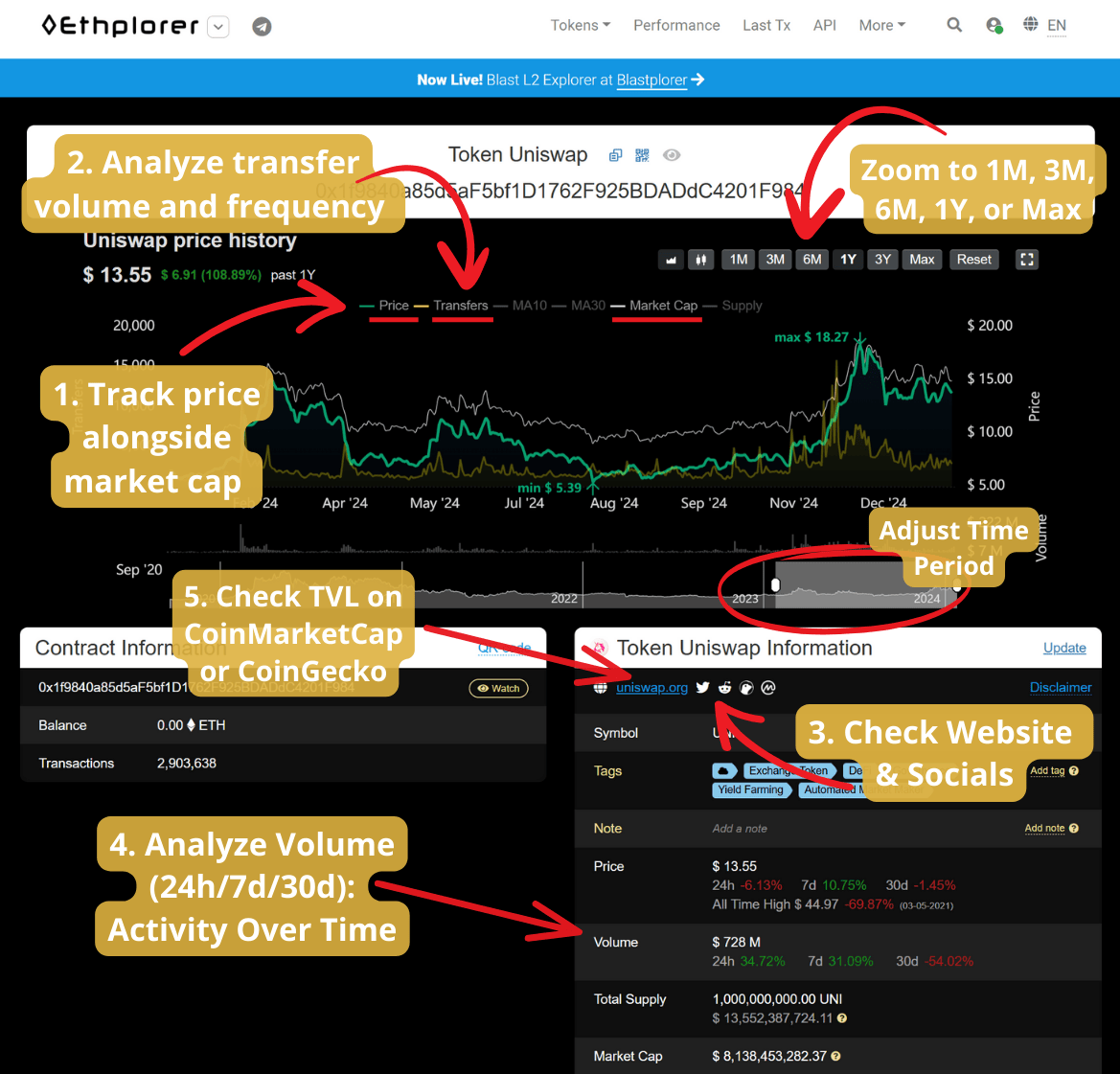 Volume â High trading volume reflects liquidity, but sudden spikes can signal manipulation. Ethplorerâs Volume (24h/7d/30d) data, found in the Information section, breaks down trading patterns over different timeframes.