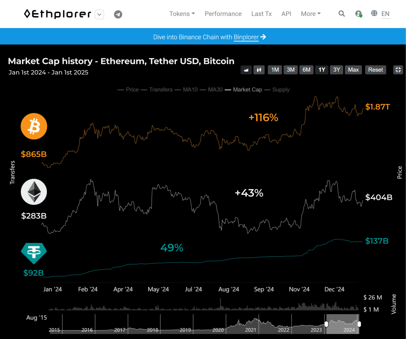 Ethereumâs performance wasnât as dramatic, but it made significant strides in scalability and efficiency. Its price climbed from $2,352 to $3,353 (+42%), with its market cap reaching $404 billion (+43%). Trading volume surged 162%, driven by major upgrades like Dencun and EIP-4844, which reduced transaction costs and improved throughput. The expansion of Layer-2 solutions further eased congestion, reinforcing Ethereumâs role as the backbone of decentralized applications.